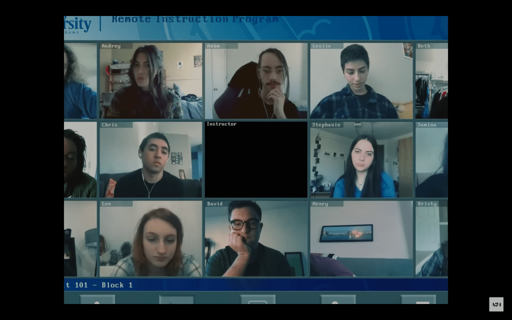 Aula online. Cabeças emolduradas num mosaico, cujo centro é um retângulo vazio. É sentido a essa ausência imagética que a câmera plana até ser engolida pelo abismo enquadrado. Pois, supostamente, este é o tema a mover o filme — o que o vazio poderia fazer ao homem?