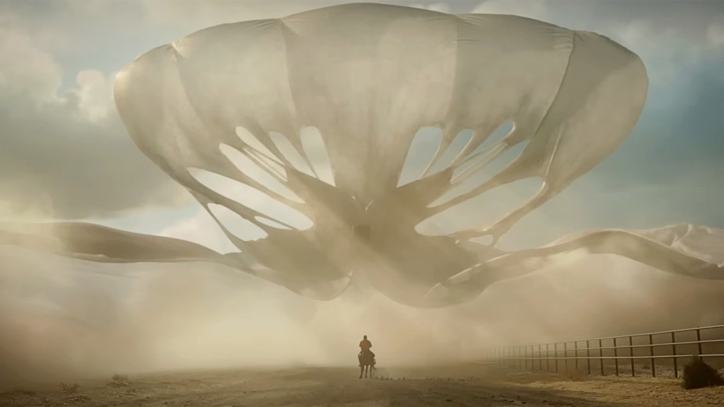 Em Aftersun, a entrevista, com câmera VHS, que Sophie faz com esse pai incógnito (O que ele faz? Do que vive?) acerca do futuro reduplica o homem, mas não soluciona seus mistérios: ele é um vulto na tela da televisão e uma imagem interrompida no espelho. Por ironia, o plano que introduz essa cena volátil é absolutamente háptico: a blusa amarela e as meias encharcadas penduradas sob o sol na grade da sacada. É a imagem mais estável do filme de Wells; as roupas da menina (no quadro em tripé) sob a luz não desbotada desses dias com o pai.