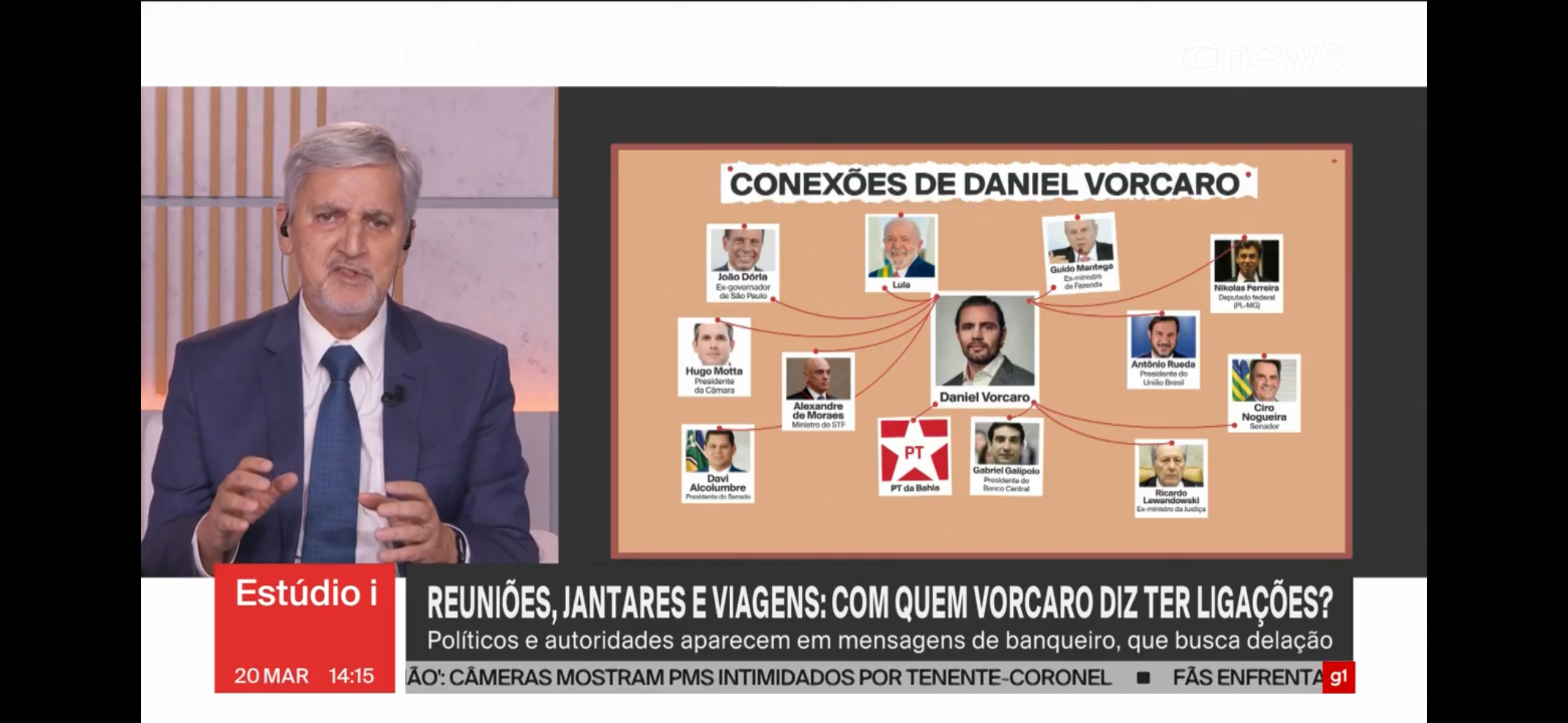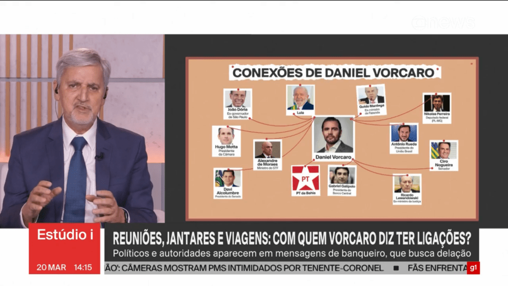 A ausência de Toffoli é notada por Valdo Cruz, e é a vez de Arthur Dapievi vir ao socorro da teia, que começa a se embolar: “é importante frisar que essa arte não significa envolvimento, significa conhecimento”. Dapievi reconhece que Toffoli é o mais envolvido, mas a ausência sempre diz algo, e as entrelinhas desta dão uma piscadela à direita do caso, uma vez que Toffoli foi defendido publicamente por Nogueira e Rueda, e conta com a simpatia de uma parcela do bolsonarismo. Na tela, no entanto, estão o ex-Ministro do governo Lula e Moraes, que é associado por parte da opinião pública a Lula, seja por ser o nome-chave na condenação de Bolsonaro, seja porque a própria Globo News reforça, sempre que pode, essa leitura do público; consequentemente, a associação em si. Assim, das onze fotos ligadas graficamene a Vorcaro, o espectador, num vislumbre distraído, associaria a Lula pelo menos seis imagens (Moraes, Lewandowski, Mantega, Galípolo, além do próprio Presidente e seu partido), podendo ainda, a depender do espectador, haver a inclusão de Alcolumbre, Hugo Motta e até João Dória, que já fez acenos a Lula.