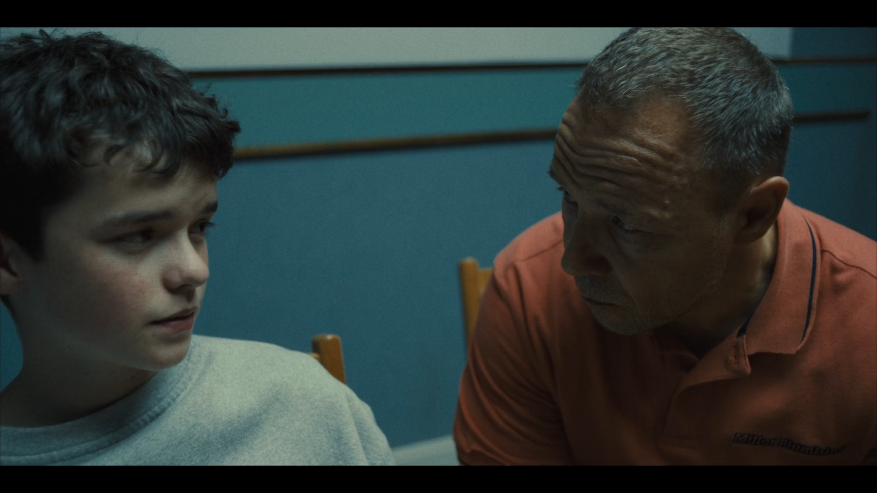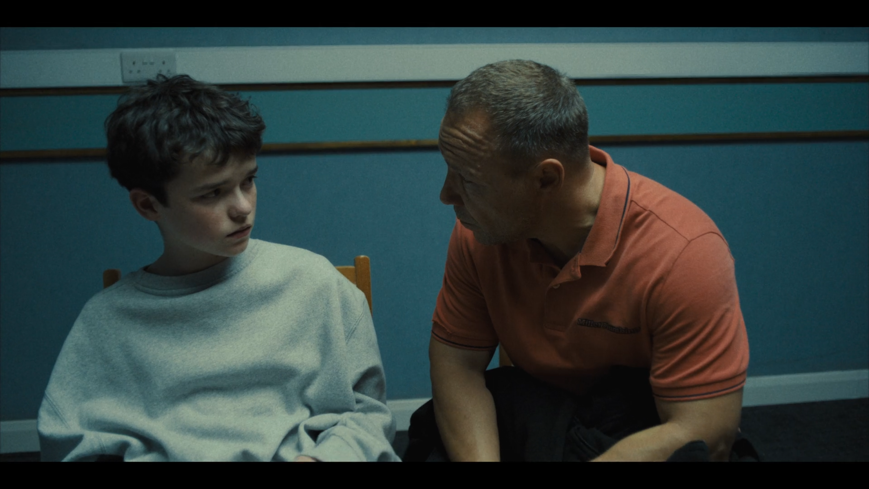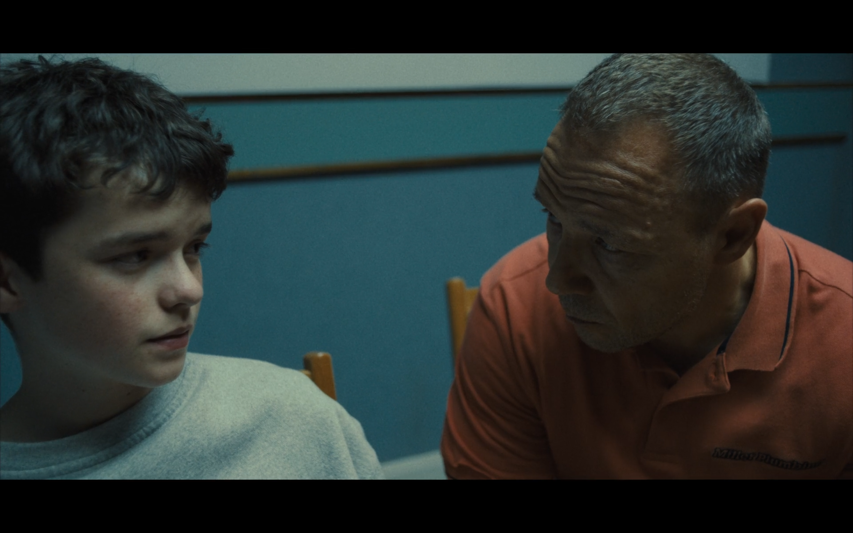Essa capacidade de não se acomodar a um ponto de vista reaproxima o trabalho de câmera do de Gus Van Sant, reconduzindo o olhar à habilidade de decupar, seja no fluxo ou no redemoinho. Dois momentos no primeiro episódio ilustram isso. No primeiro, quando deixados a sós na sala de interrogatório, Eddie (Stephan Graham), o pai, se inclina para falar com o filho, Jamie (Owen Cooper), 13 anos, acusado de assassinar uma colega da escola. Na composição, o rosto do menino — num ¾ frontal — é mais visível, enquanto o pai, de perfil, anuncia — “vou te perguntar uma vez só, tá?”. A fala antecipa e a câmera entende o que vem aí; sabe também que não é justo que a mais dolorosa das perguntas ocorra diante de um rosto e meio (o do filho por inteiro, o do pai pela metade). Então, essa câmera humanamente idealizada — que não treme ou tropeça, mas sabe diagnosticar emoções — se aproxima e faz uma discreta correção à esquerda, reenquadrando pai e filho em equidade. Os dois rostos em ¾ frontais, a sustentação dos olhares comunicada na imagem: “Foi você?”.