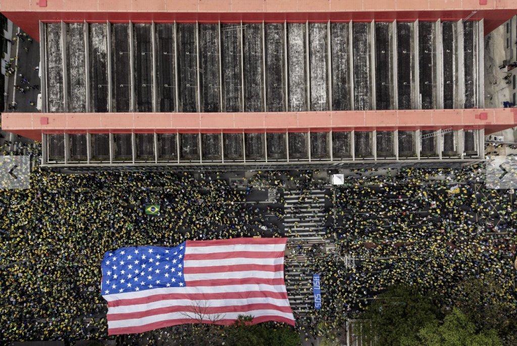 É verdade que as cores do lado de fora remetiam também a um imaginário natural, mas estampavam o Dri-fit, tecido artificial que, como informa o site da Nike, foi desenvolvido para absorver e evaporar o suor, “ajudando a manter você seco e confortável”. É também verdade que não há garantias de que todas as conhecidas camisetas da CBF tenham sido compradas pelo valor de R$ 359,99; é provável que uma ou outra tenha vindo da 25 de março, rua usada como boi-de-piranha às sanções recentemente impostas pelos Estados Unidos. De qualquer forma, um pontilhismo verde amarelo ocupava o cinza do asfalto, com frouxidão o bastante para que a forma revelasse o fundo. E foi dessa turba de Zés Cariocas-paulistanos, costumeiros vociferadores de que a bandeira jamais será vermelha, que se estendeu, pasmem, o pano em listras vermelhas e brancas. O contraste é, antes de tudo, formal: se o amarelo se distribuía em pontos, a bandeira dos Estados Unidos se erguia maciça sobre as cabeças e mentes de quem pedia uma recolonização; alguns por falta de conhecimento histórico, outros, por excesso, por crerem na chance de, um dia, quem sabe, tornarem-se os capitães donatários que redefinirão definitivamente as fronteiras entre si e os capitães da areia.