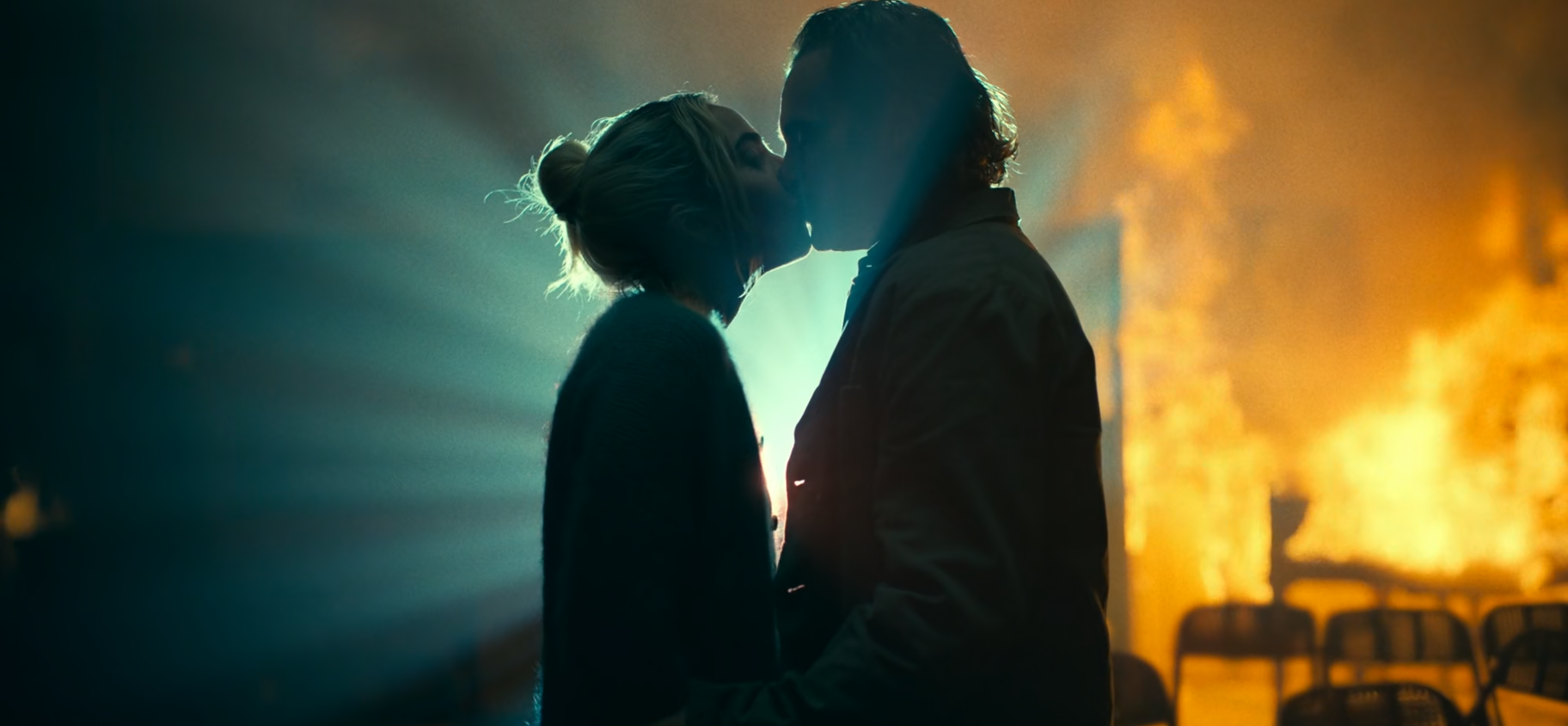 Delírio a dois tem o cuidado de pactuar logo o novo velho gênero: inabitual em universos de super-heróis, a brecha musical aparece nas aulas de música que Arthur Fleck (Phoenix) passa a frequentar no presídio, recompensado pelo bom comportamento. É lá que ele conhece Lee Quinzel, a Arlequina interpretada por Lady Gaga, de Nasce uma Estrela. A lembrança do remake de Bradley Cooper não é gratuita; a própria escalação de Gaga parece evocar seu trabalho anterior: outrora estrela-título, nascida entre pequenas tragédias cotidianas, ela, agora, tenta reavivar uma estrela minguante — e que nunca deveria ter sido.