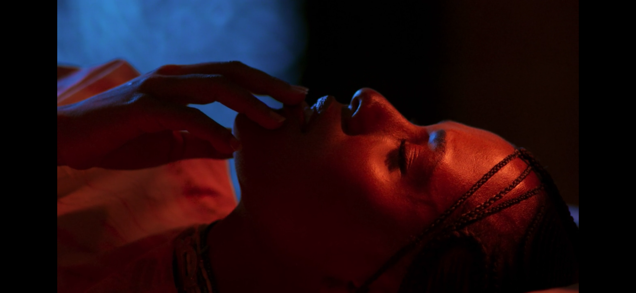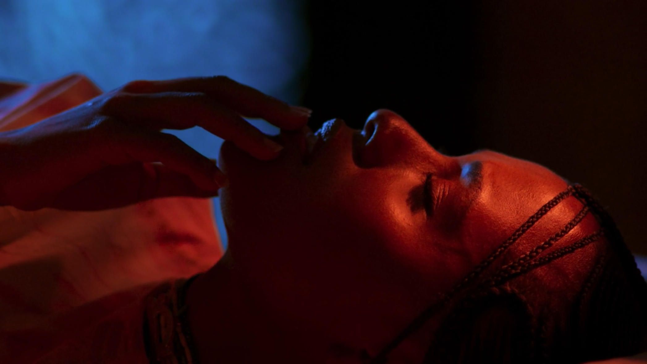 Como ensina Bruce Block, no livro A Narrativa Visual, a separação entre cores quentes e cores frias pode acentuar a impressão de profundidade, já que as cores quentes costumam parecer mais próximas, e as frias, mais distantes. Assim, na imagem, a impressão de profundidade é potencializada pela localização do azul no background — isto é, na camada mais profunda da imagem —, e o vermelho sobre a atriz, em primeiro plano, mais próxima ao nosso olhar.