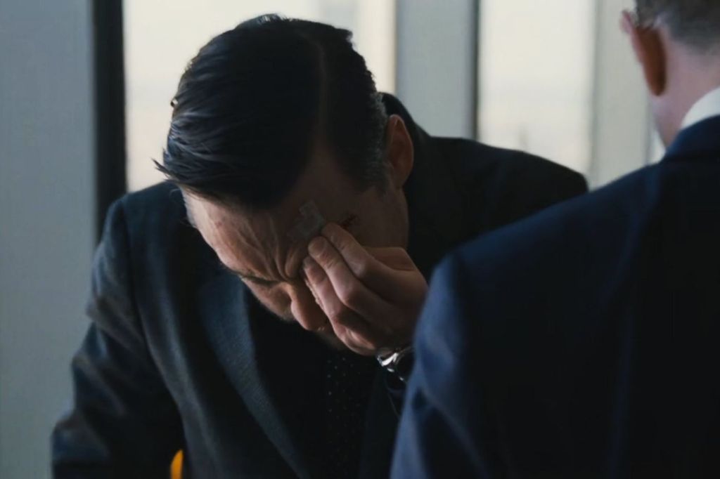 Na sala do pai, Roman é o primeiro a hesitar; Kendall, então, dá o abraço que abre os pontos na sobrancelha do irmão. O sangue marca a ameaça de uma nova cegueira a esse Édipo reconhecível a olho nu, de tão raso. A cena termina com uma articulação de imagens — uma escultura (um elmo), uma gravura (Shakespeare?), uma capa de revista (Logan). Na sala de reuniões, é a vez de Shiv vacilar na encenação dos olhares, que desviam de Kendall e tentam ver a face oculta (o corte reaberto) de Roman. A hesitação se torna epifania quando Kendall evoca a memória do pai, desvelando a si próprio como farsa (que vem depois da tragédia), boneco inflado pelo fel entranhado pelo pai ao longo dos anos, cópia volátil (e volúvel) que não ressuscita nem restaura o patriarca original, que, bem ou mal, servia de ponte entre eles e o mundo. Hamlet aqui é simulacro de um símbolo e flutua neste mundo de imagens desenraizadas.