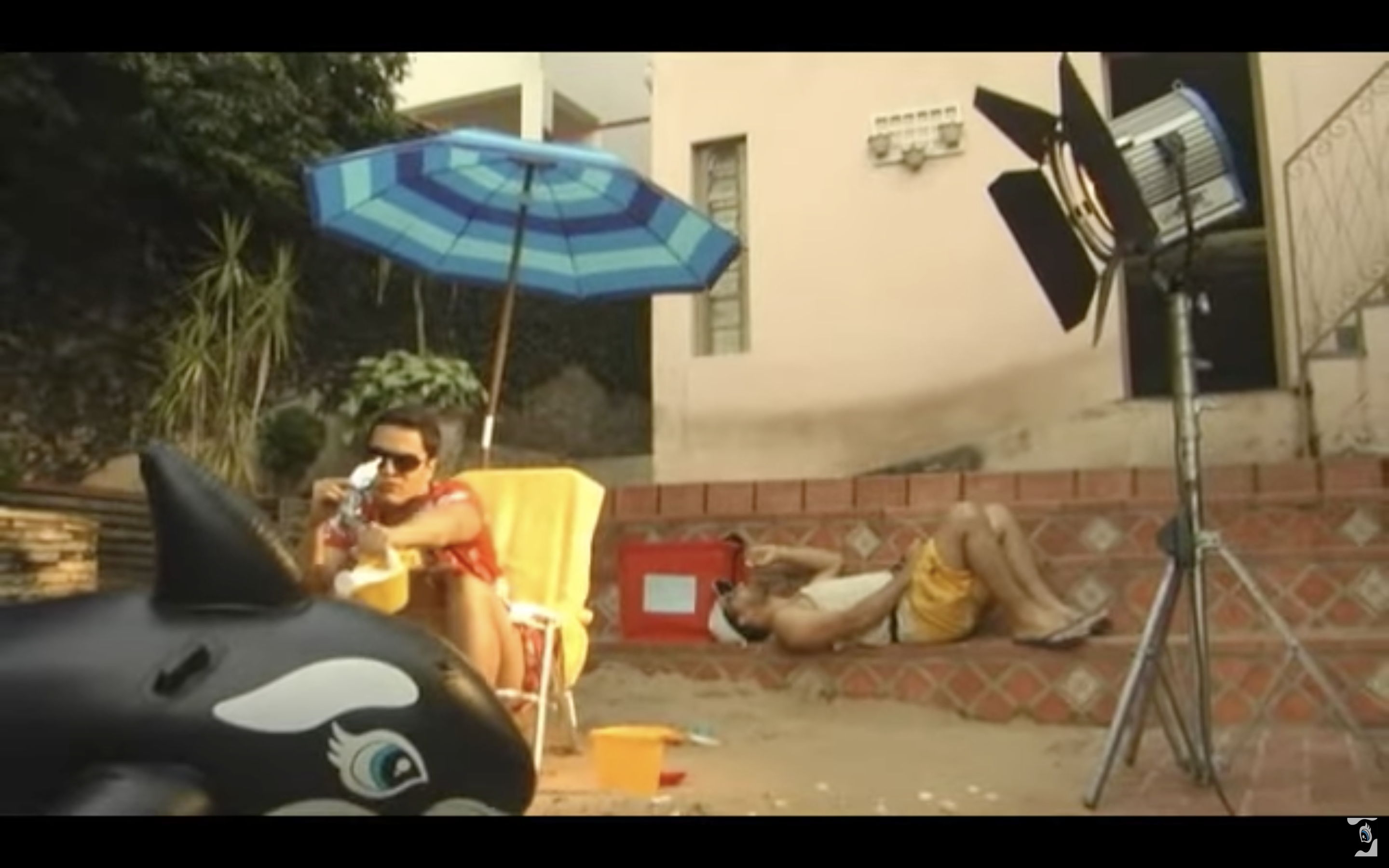 Na advertência, o sorveteiro real — redimensionado à ficção — ganha uma dupla intenção: é preciso que o Pernambuco ficcional não despreze o personagem que André compõe — um sujeito esnobe, que parece estar em Ibiza, e não numa praia de quintal —, assim como é necessário que o sujeito factual não deprecie nem desacate essa ilusão de areia. Pernambuco entra no personagem a ponto de passar protetor solar nas costas do único companheiro de cena. Talvez um prop essencial tenha completado definitivamente essa imaginação: a boia de baleia, pedaço de plástico simpático que, uma vez posto no chão, pesa e descompensa a câmera. É sob um plano holandês que André rega a pele do Free Willy de brinquedo, trazendo água a essa praia sem piscina.