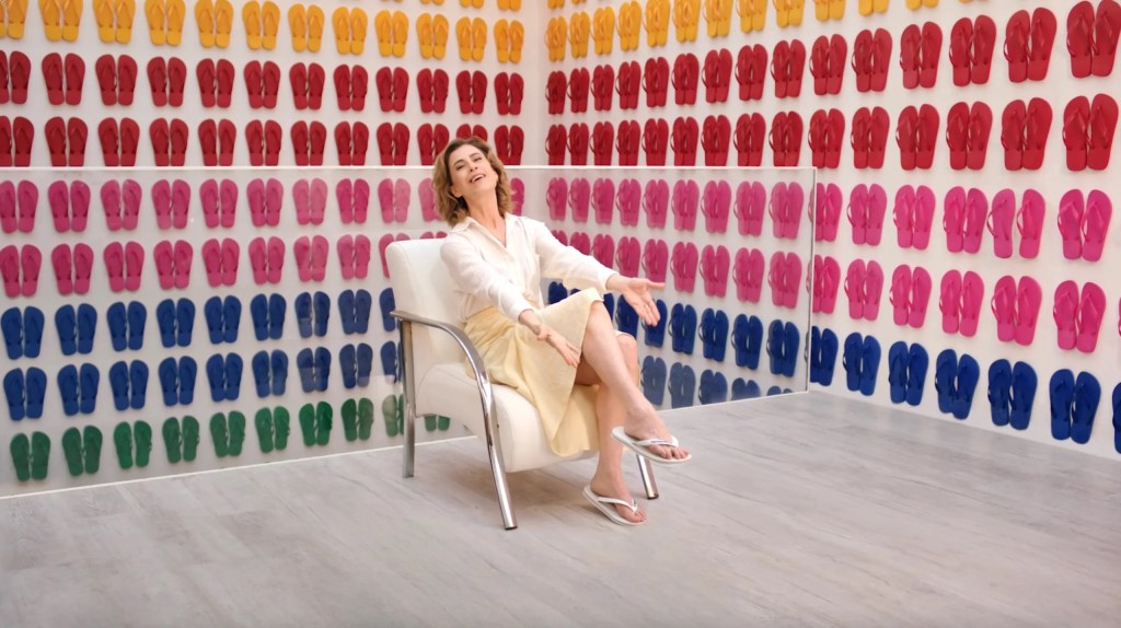 Não fosse a parede de alpargatas ao fundo, o comercial poderia ser confundido com mais um daqueles que Fernanda faz para o Itaú, com valores liberais diluídos em discursos afetuosos de autoajuda, tudo isso embalado no acolhimento do olho no olho, na quebra da quarta parede. Isso porque os valores são os mesmos, e nem é preciso ir ao fundo do discurso para que se perceba: numa síntese, o que Fernanda diz é “faça sua própria sorte” ou “conquiste por méritos próprios” ou ainda “caminhe com coragem e com os próprios pés”. Poderia ser uma campanha de Don Draper em Mad Men, porque, em suma, o que se prega é “seja um self-made man / woman”. Mais capitalista, impossível.