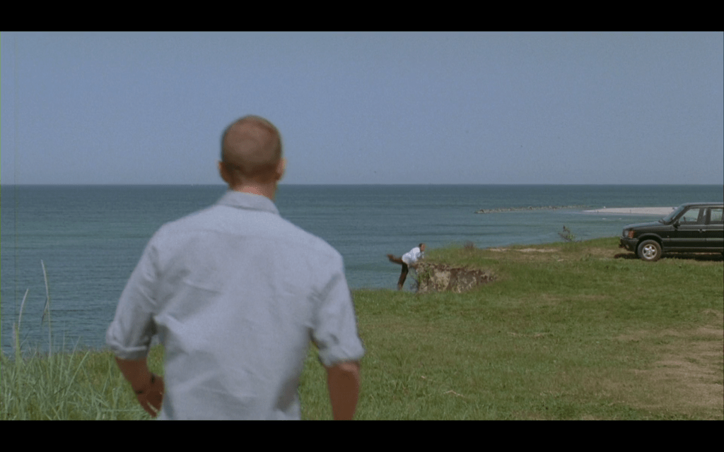 A triangulação entre personagens e olhares suspende a ação, garantido que essa história seja não só de desejo, mas de desejo e morte. Thomas assiste o instante do acidente e Ali lutar contra a queda na encenação em profundidade. Em seguida, é Laura quem olha para o marido, mas logo se desvencilha em direção a Thomas, um ponto distante, mas firme, definitivo, contraponto ao que oscila dependurado. Bordeado pelo barranco, Thomas retribui demoradamente o olhar, vendo-a no contracampo, como uma presença distante, mas inteira, desimpedida, e, principalmente, que o encara de volta, sem titubear. A estabilidade rigorosa entre os olhares marginaliza ainda mais o que já está à margem, o vértice instável e frágil desse triângulo amoroso. Laura deposita em Thomas uma decisão. O corte no mesmo eixo retorna ao amante, rosto e pés firmes, mas que, enfim, disparam em socorro ao outro.