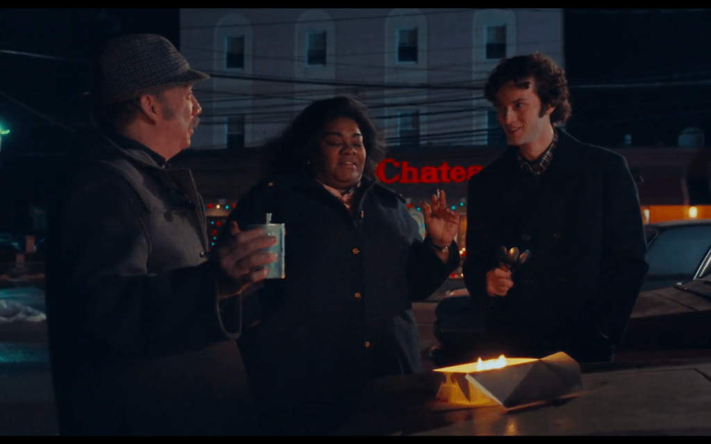Nessa história sobre Histórias (com “H” maiúsculo e minúsculos) e sobre decidir quem tem ou não direito a acessar histórias privadas, (como diz Paul), Da’Vine Joy Randolph vive Mary Lamb, essa mulher cuja história — a morte do filho no Vietnã — goteja pelo filme até enchê-lo; não na tragédia em si, mas no sintoma implícito e universal da dor. É manuseando esse conta-gotas que Randolph subverte um dos principais estereótipos atribuídos a mulheres negras no cinema estadunidense (e pelo mundo afora) — a mammie. Joel Zito Araújo, que remonta o início desse estereótipo ao filme Lysistrata (1914), o descreve:
