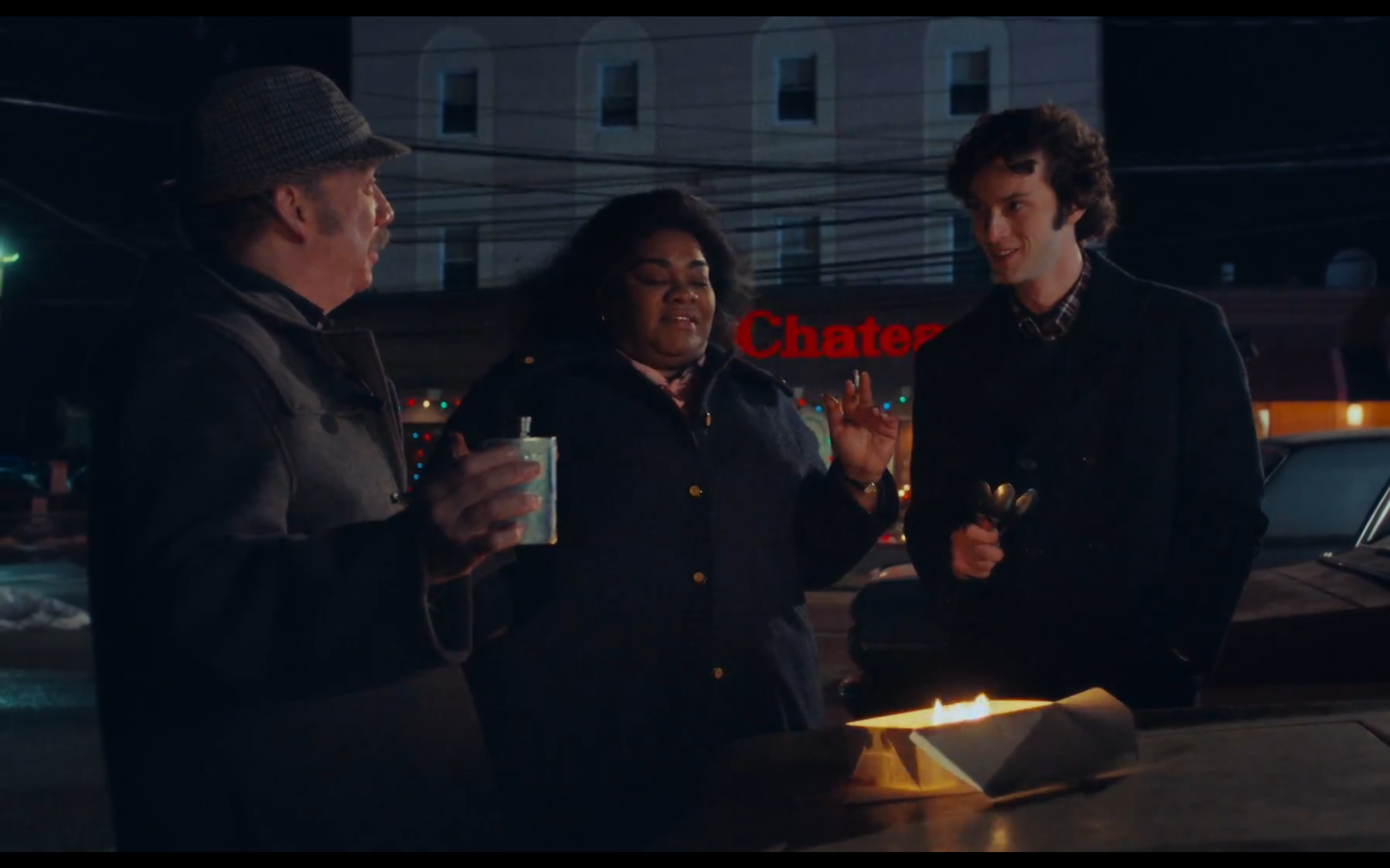Mas nada sintetiza Mary como a cena que marca seu retorno para o último ato, quando a cozinheira resolve o problema da sobremesa “ilegal” (por causa do conhaque que seria servido a Angus, menor de idade): ela pede os ingredientes para viagem; o trio, então, flamba o doce sobre o porta-malas do carro. Mary nutre, mas não pelas vias esperadas, não pelo ato de cozinhar, mas pela ideia, brilhante, afetuosa, única. Payne decupa essa ação em dois planos simples, quase banais, complementando a máxima: “se não há nada de novo, tampouco há tantas maneiras de mostrar certas coisas”. Mostra como dá, como tem que ser. Um diretor honesto em sua despretensão (não se enganem, essa sim, mensurada). No contexto em que ressurge, um anti-Lanthimos.