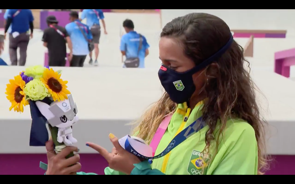 Mas foi ao final da entrevista, concedida à Globo à beira do pódio, que veio o lampejo desconcertante, a beleza do gesto mínimo e inusitado. Rayssa estica a medalha para mostrá-la à câmera e imediatamente os aplausos soam do extracampo. Então, quando a conversa parecia encerrada, ela chama o repórter e, por trás da máscara, solta – “ô, ele é maior fofinho”. O repórter demora um instante a entender; mais rápida, Rayssa repete apontando o indicador ao Miraitowa, o mascote olímpico preso ao buquê de flores. Encara o bichinho encantada, com uma admiração genuinamente infantil, de quem é capaz de encontrar beleza numa pelúcia. É nesse pequeno momento televisionado que está a fotogenia (se preferirem, telegenia), na menina que vê naquele um símbolo que sobrepõe a medalha, a bandeira, porque está ali a própria infância e o futuro, que as infâncias costumam carregar.