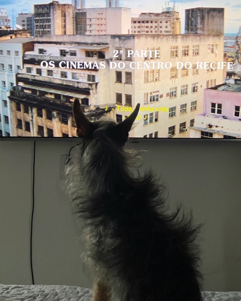 Curiosamente, o título provisório desse não-filme era (é?) A Casa é o mundo e os nossos fantasmas. Tentei pôr minha voz como cola dessas imagens, mas a voz não soava minha (provavelmente porque era excessivamente minha). Em Retratos fantasmas, Kleber Mendonça Filho assume sua voz de autor/narrador como rejunte movediço, que anexa sua casa cinematográfica (permanência, apesar dos cupins, da especulação, das igrejas) aos cinemas de rua (impermanência, entre cupins, especulações e igrejas). Nina já cochilava, mas Margot investiu, entre latidos, contra o fantasma de Nico, o cachorro morto, vizinho de Mendonça Filho no Recife, mas que, em Bauru, a respondia (ou a provocava) na TV. Ela, no entanto, não se importou com o desfile do gato entre a serpentina cortante do muro, plano que Mendonça Filho havia exibido em uma palestra que assisti em Cambridge.
