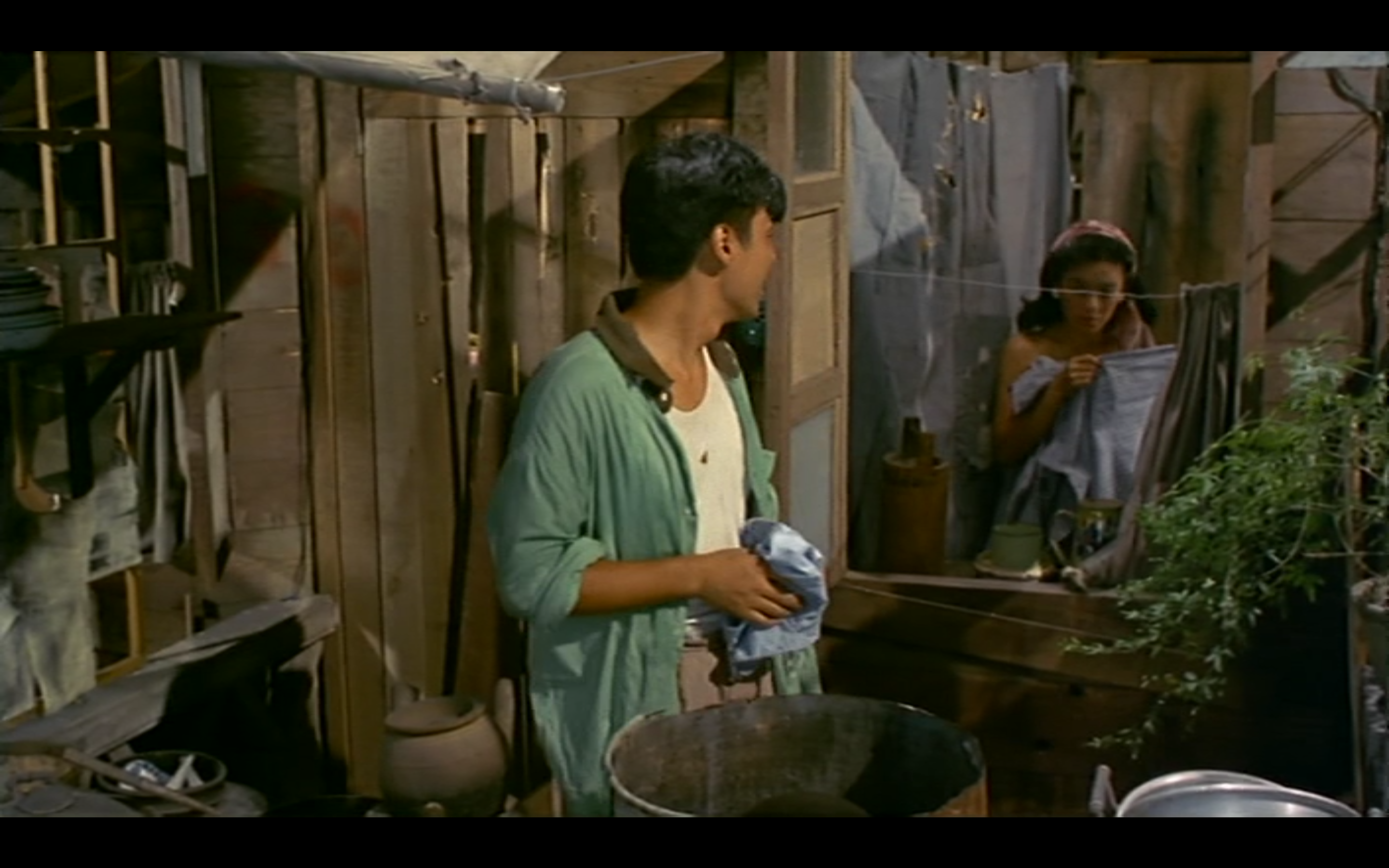 A cena começa quando Tung — também conhecido como do Do-Ré-Mi — convence Shu a subir até seu apartamento para arranjar-lhe roupas secas, depois de terem sido apanhados pela chuva. Shu titubeia, mas aceita a oferta. Nenhum deles suspeita que há um Ladrão dentro do apartamento, porque, assim que entram, o sujeito consegue se esgueirar para outro cômodo, separado por uma porta de tábuas mal ajambradas. Mas Shu precisa se trocar, e para dar privacidade a ela, Tung segue para o esconderijo do Ladrão, que, no típico timing de uma fração de segundo, se enfia dentro de um barril. Tung e Shu demoram alguns instantes até notarem que, naquela casa de escombros bricolados, não há privacidade, já que há sempre uma janela, uma fresta ou um buraco à espreita. Dão de cara um com o outro e, desconcertados, correm em convergência; na gag de comédia romântica, tromba-se seminus.