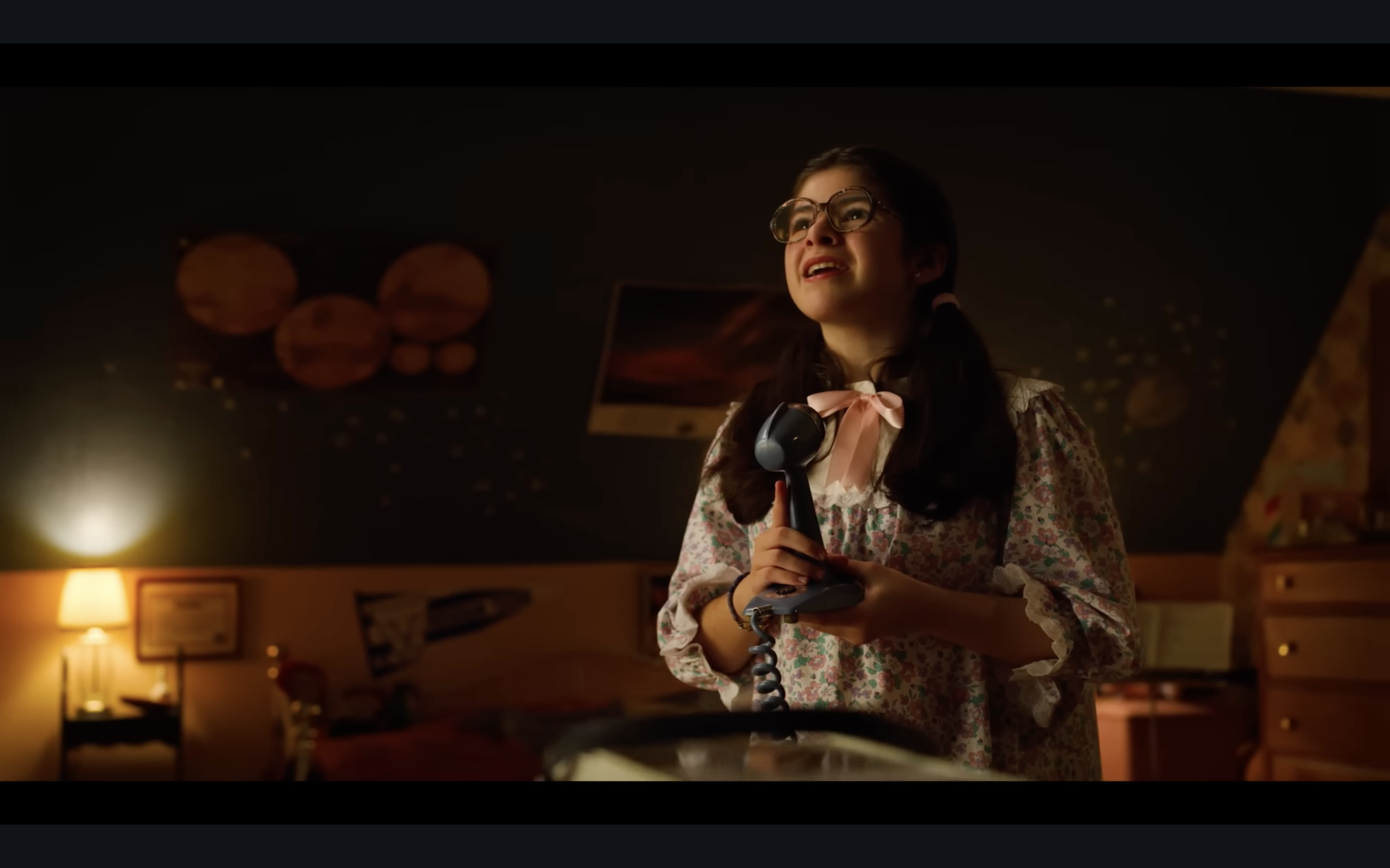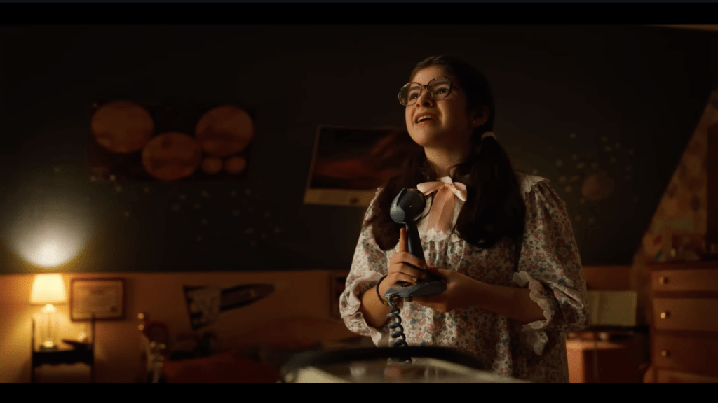 Dustin tenta negociar, mas Suzie é irredutível. Então, sob um céu noturno com nuvens contornadas pelo luar, ao lado de Érica (Priah Ferguson), ele solta um “shit” e inicia a tarefa da guardiã do limiar; com o esganiçado da puberdade, canta: “Turn around. Look at what you see…”. Ao longo dos primeiros versos, à capela, a câmera faz um travelling-in sentido ao rosto de Matarazzo, um dos mais singurales de Stranger Things. O corte inicia a sequência de montagem, que intercala todos os personagens — crianças, adolescentes e adultos — reagindo àquela provação inesperada. O primeiro é, justamente, Steve, o melhor amigo que, a bordo do porta-malas de um carro com Robin, vira o rosto meio incrédulo não mais com o monstro gigante colado ao vidro traseiro, mas com essa aparição da infância em sua forma mais genuína, em meio ao perigo de morte. Ao contrário dele, Robin sorri diante desse inesperado ordinário, contraste bem-vindo ao fantástico recorrente. A música surge definitivamente, com o instrumental encobrindo os demais sons diegéticos, incluindo as pegadas monstruosas. Aos adultos, só resta esperar; na dependência da curiosidade infantil (que faz com que as crianças saibam o que eles não sabem), precisam respeitar esse tempo da infância, que é outro, é skholé. Em determinando momento, a distância geográfica é superada pela tela dividida entre Dustin e Suzie. Ela encarna um paradoxo: olhando levemente para o alto e com uma das mãos estendidas para cima, reproduz uma encenação ufanista em tempo de Guerra Fria; a música, no entanto, canta sobre outra história, outro mundo, em consonância com o background que, preenchido por estrelas e planetas adesivados, compõe um céu artificial. Talvez por isso, quando os versos finais chegam, o olhar alto e esperançoso de Suzie murcha em pleno plano. Um desencanto se avizinha nesta última cena de plena infância de Stranger Things.