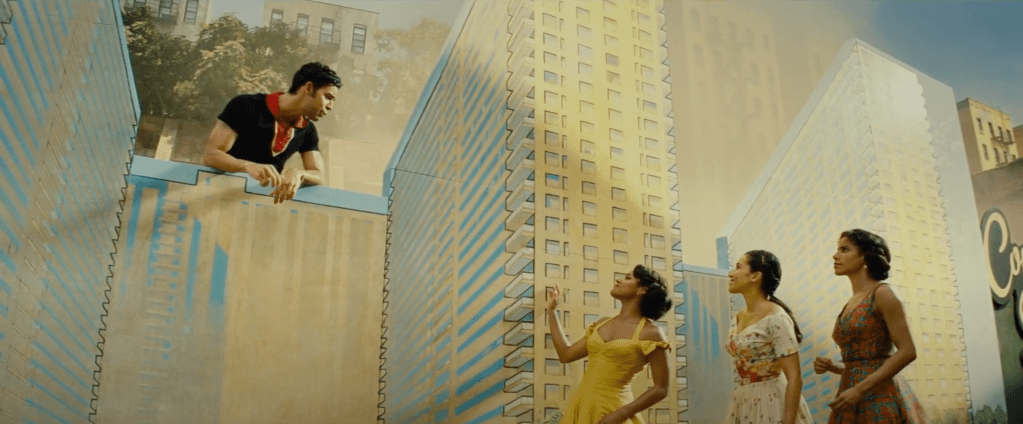 As primeiras notas soam e a câmera sobe pelo beco de varais lotados que atravessam de um prédio a outro. Ao fundo, no vácuo das roupas penduradas, Anita (Ariana Debose) aparece para protagonizar a sequência de América, numa releitura que torce as ambiguidades do número interpretado por Rita Moreno há seis décadas. Anita recolhe as roupas, e a corrida das peças pela corda cria um efeito de cortina que vela e desvela o jogral dos primeiros versos. O espetáculo vai começar. Mas não será restrito à laje-palco, como no filme de Robert Wise e Jerome Robbins; Anita cruza a janela, encontra as vizinhas no corredor e, juntas, partem em direção às ruas nova-iorquinas para cantarem I like to be in America.